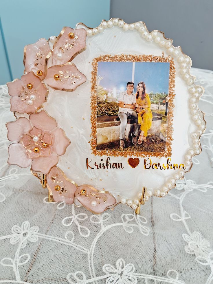 Capture your love story with this Customized Resin Photo Frame, handcrafted with a soft pink floral design, pearl border, and golden sparkle accents. Personalize it with your names, initials, or a special message to make it a memorable keepsake.This beautiful resin frame is perfect for anniversaries, engagements, weddings, or gifting your partner. The floral details and pearl work give it a luxurious and elegant look, making it a stunning piece for both décor and memories.