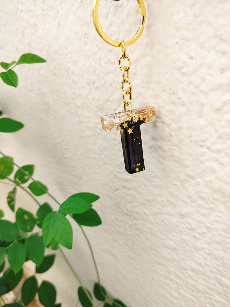 Customized Resin Alphabet Keychain – Letter T. Handmade resin keychain with black & gold star design, golden flakes & luxury finish. Perfect for gifting & daily use.