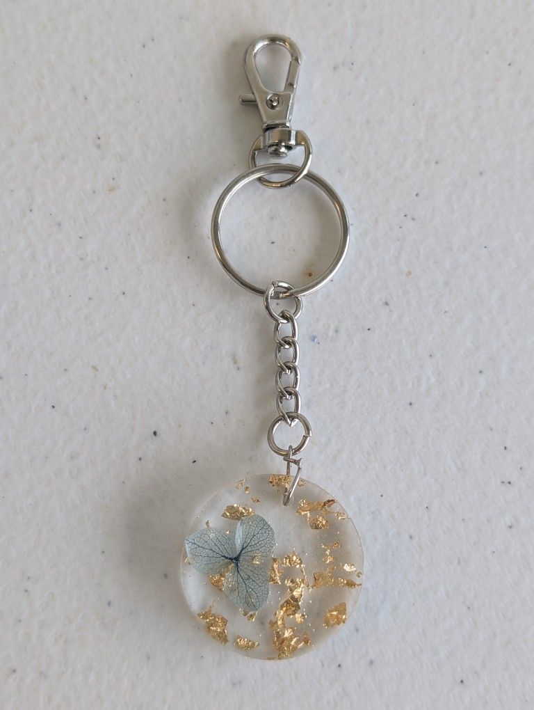 Customized Resin Floral Keychain with blue flower and gold flakes. Handcrafted round resin keychain, lightweight, stylish, and perfect for gifting.
