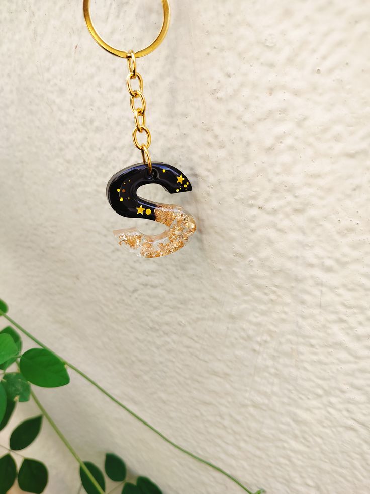 Shop the elegant Resin Alphabet Keychain Letter S with black, gold, and star accents. Perfect personalized accessory or gift for your loved ones.