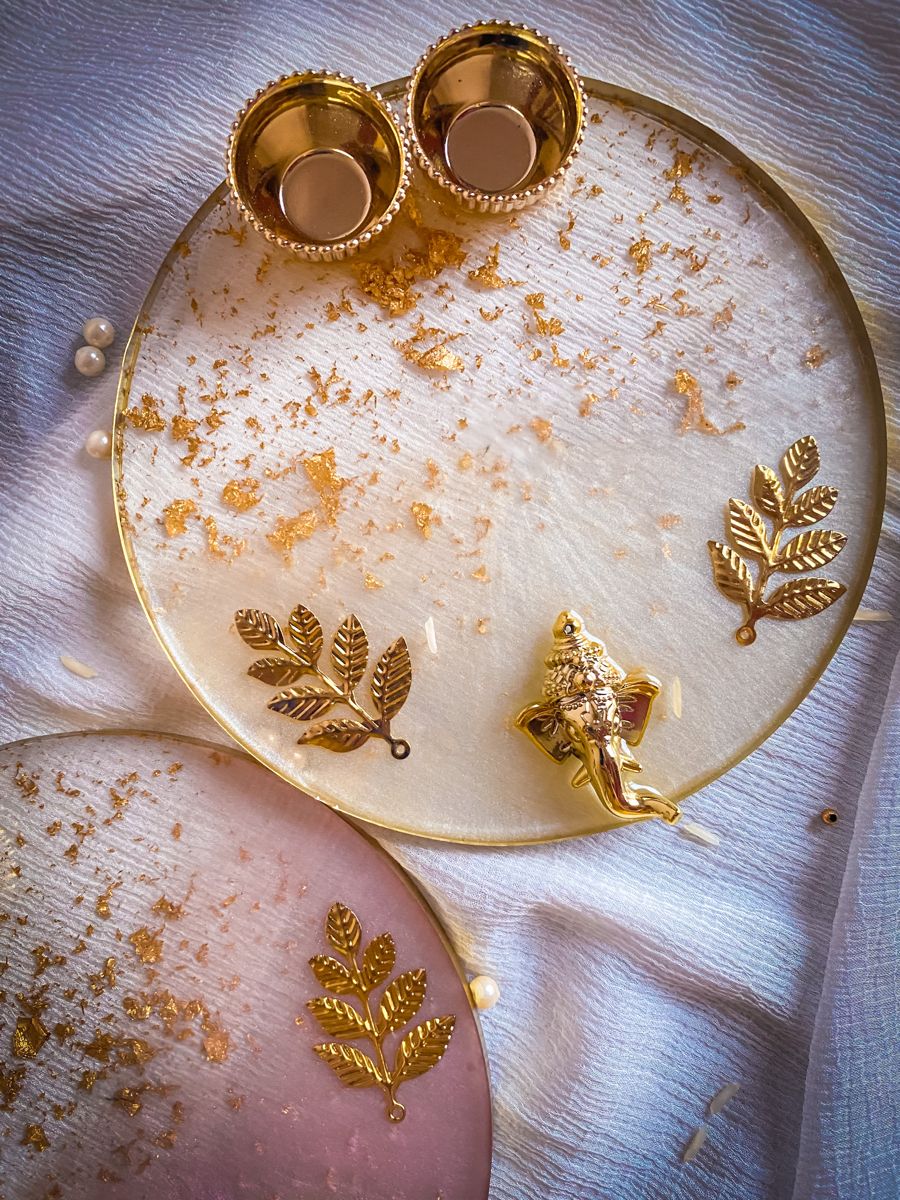 Elegant handcrafted white resin pooja platter with golden bowls, Ganesha idol, leaf motifs, and gold foil accents. Perfect for weddings, housewarmings, Diwali, and festive gifting.