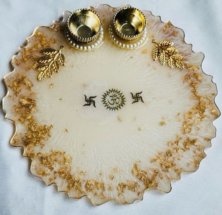 Bring purity and elegance to your rituals with this handcrafted white resin pooja platter, designed with a glossy white finish and decorated with shimmering golden foil accents. The centerpiece features a divine Om symbol with Swastik motifs, symbolizing positivity and blessings. The platter is further adorned with golden leaf embellishments and includes two golden bowls with pearl borders, ideal for roli, chawal, kumkum, or diya essentials.This platter is a perfect choice for weddings, housewarmings, Diwali celebrations, engagements, and festive gifting, offering both devotion and luxury in a single piece.