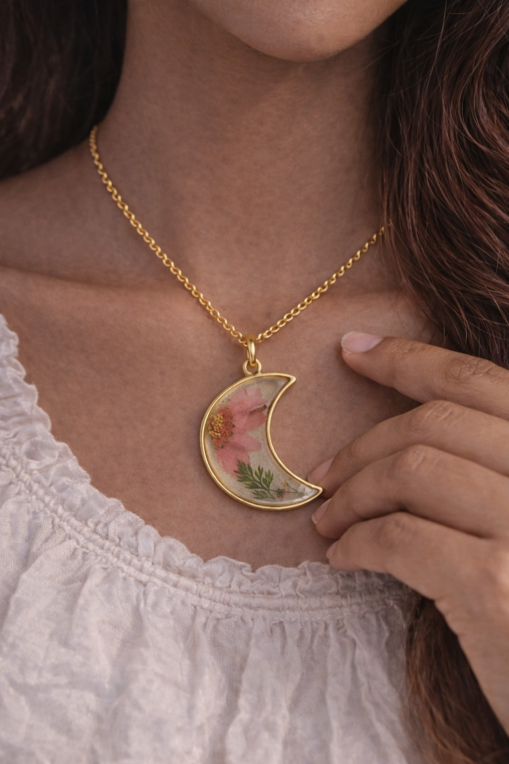 Unique handmade crescent moon resin necklace featuring real pink dried flowers. A celestial botanical pendant with a gold chain, perfect for gifts and everyday wear.