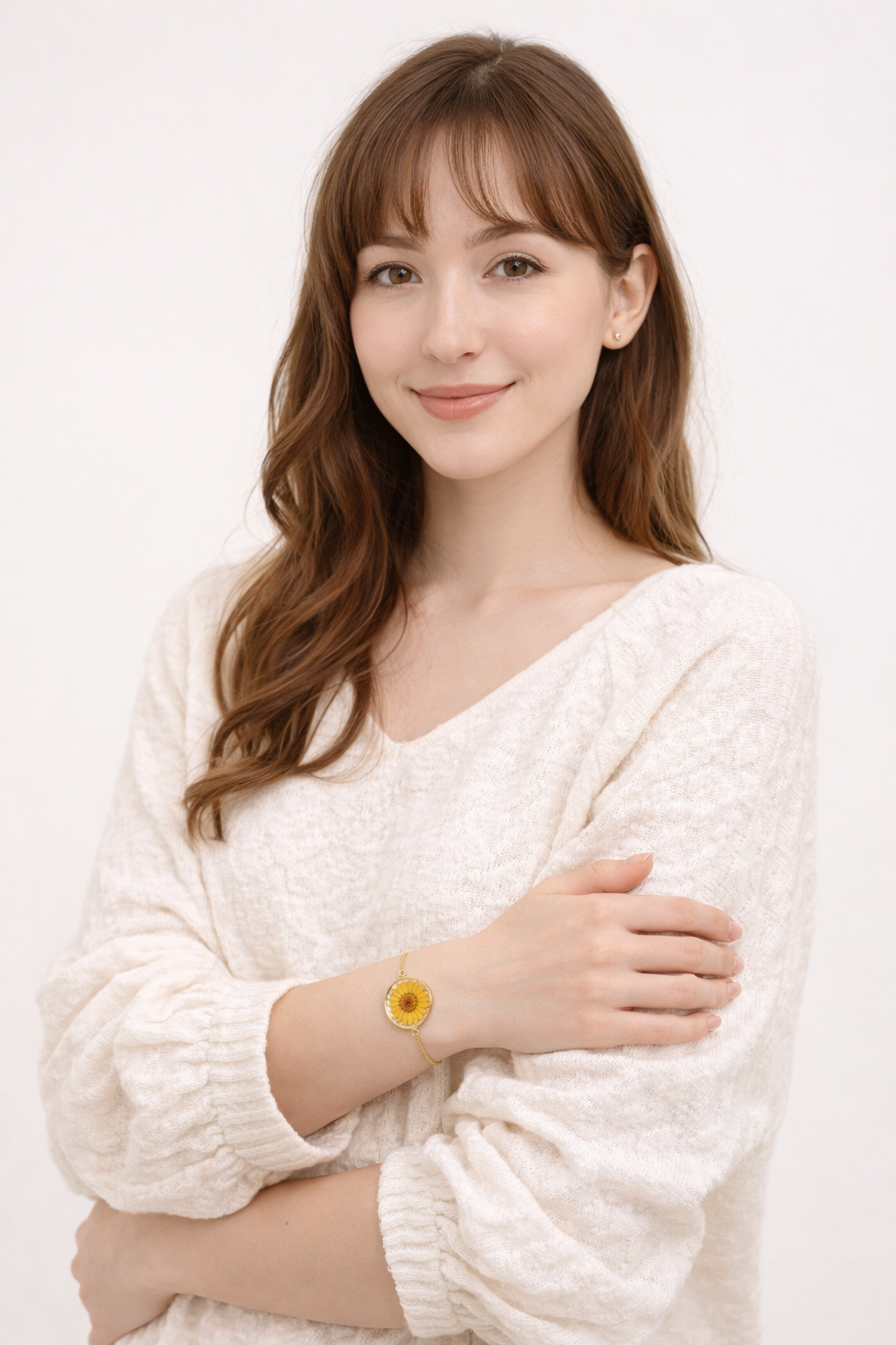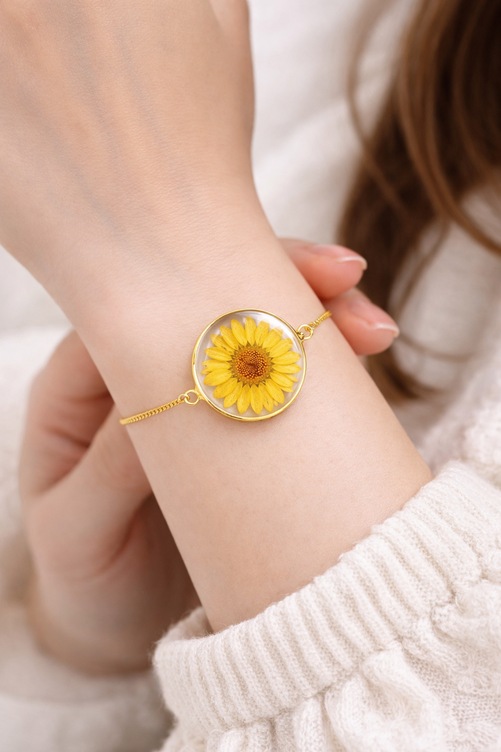 Real Sunflower Resin Bracelet – Handmade Floral Gold Chain Bracelet for Women